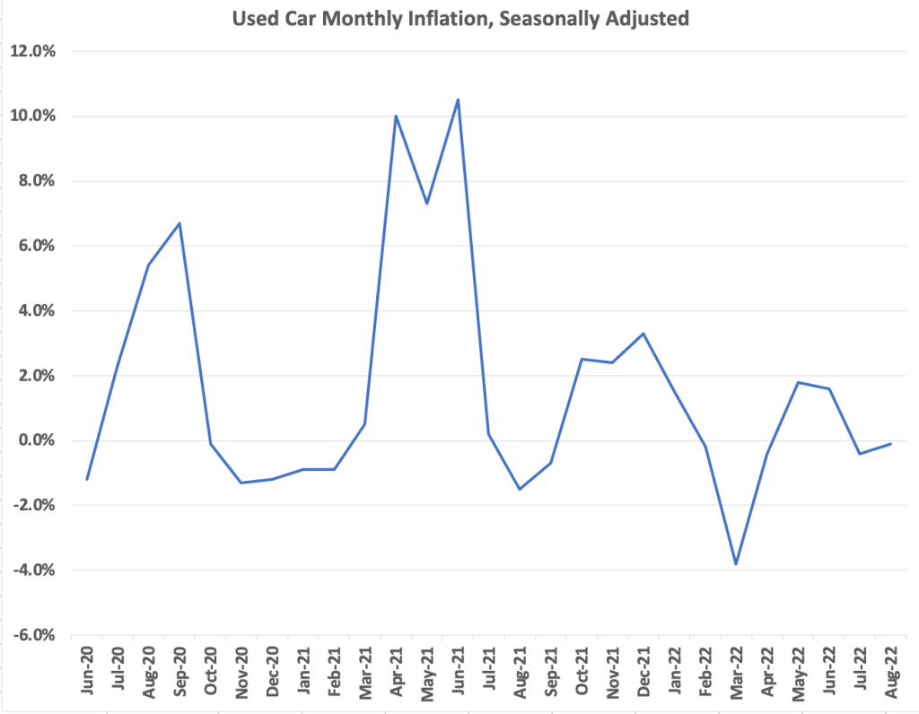 On a year-over-year basis, we can see that used vehicle inflation has come down dramatically. The following chart shows the month-over-month inflation for used vehicles and shows that there have been periods of used car deflation recently: