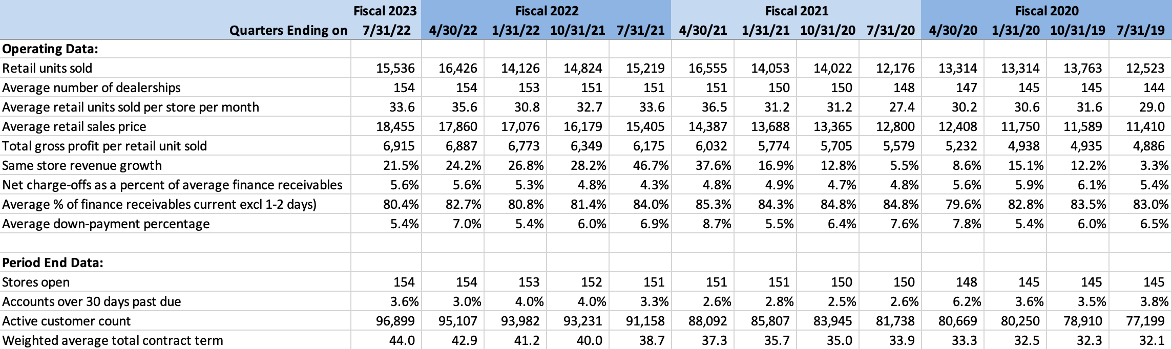 The following exhibit shows key operating metrics for Car-Mart since the quarter that ended on July 31, 2019. The purpose of presenting the data for three fiscal years is to see trends that took place prior to the pandemic as well as what has happened since.