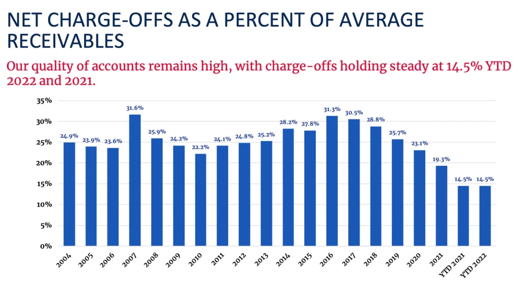 The following chart from the company’s third quarter fiscal 2022 investor presentation shows that net charge-offs as a percentage of average receivables have trended downward during the pandemic. I would expect that this figure is likely to return to historical levels as pandemic-era stimulus effects wear off and the longer installment terms begin to take a toll on the number of customers who default. (Note that YTD 2021 and YTD 2022 items in the graph cover three quarters of charge-offs. The full year charge-off was 19.3% in 2021 and 20.2% in 2022.)
