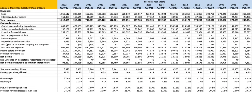 The following exhibit shows Car-Mart’s balance sheet over the past decade. Note that the balance sheet at April 30, 2022 has less granularity because it is derived from condensed summary information appearing in the company’s recent earnings release. The 10-K for fiscal 2022 should be filed with the SEC by late June or early July.