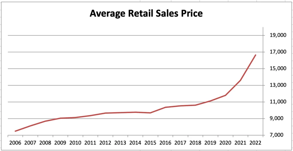 The reality is worse than the chart indicates. While the average retail sales price for fiscal 2022 as a whole was $16,649, the average sales price in the fourth quarter of the fiscal year shot up to $17,860. Two years ago, the average sales price was just $11,793.