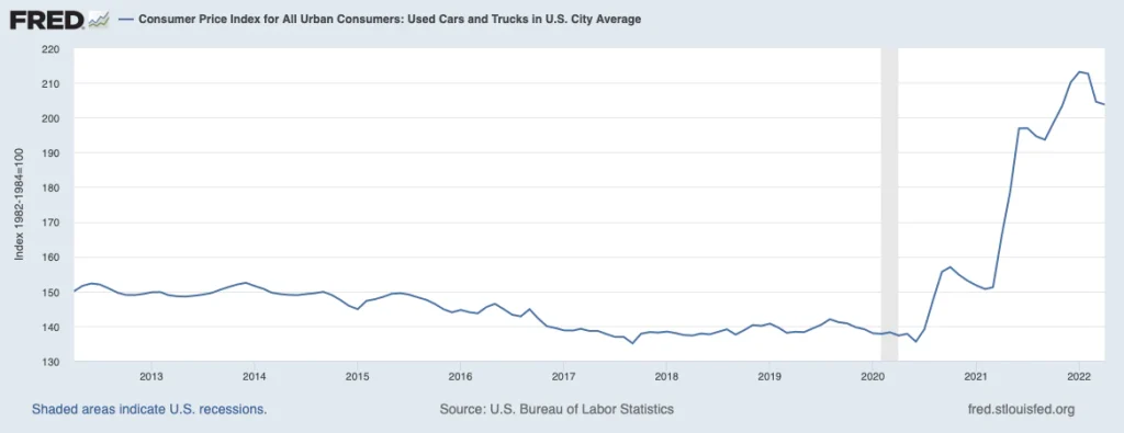 Unfortunately, the news is not all good. The government’s response to the pandemic has also increased inflation dramatically, and few categories have seen more inflation than the price of used vehicles, as we can see from the exhibit below: