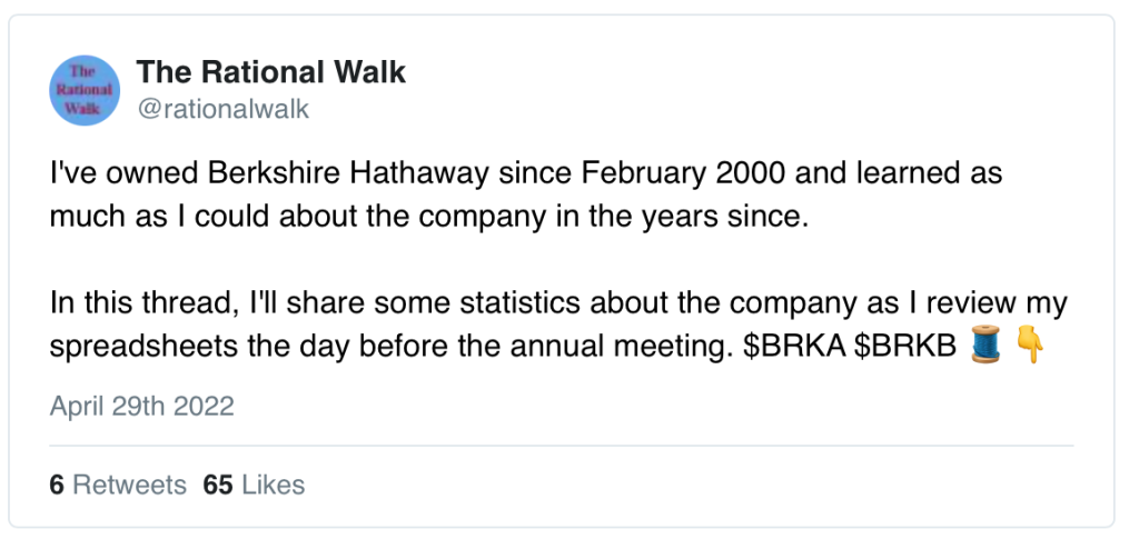I know that many of you will be watching the Berkshire Hathaway annual meeting tomorrow either in person or via webcast. I created a thread on Twitter this afternoon with some statistics regarding the company. The first tweet in the thread appears below. You can view all of the tweets in a formatted PDF file.