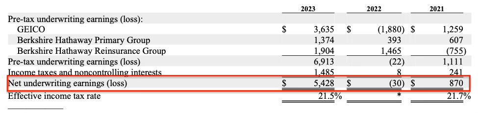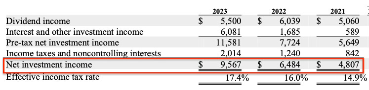 Investment income jumped to $9.6 billion in 2023 from $6.5 billion in 2022 due to the impact of higher short-term interest rates on Berkshire’s large investment in treasury bills. Dividend income declined due to dispositions of dividend-paying stocks since the end of the third quarter of 2022, partially offset by higher dividend rates on investments that Berkshire has continued to hold.