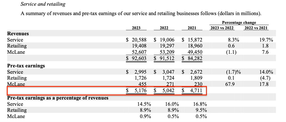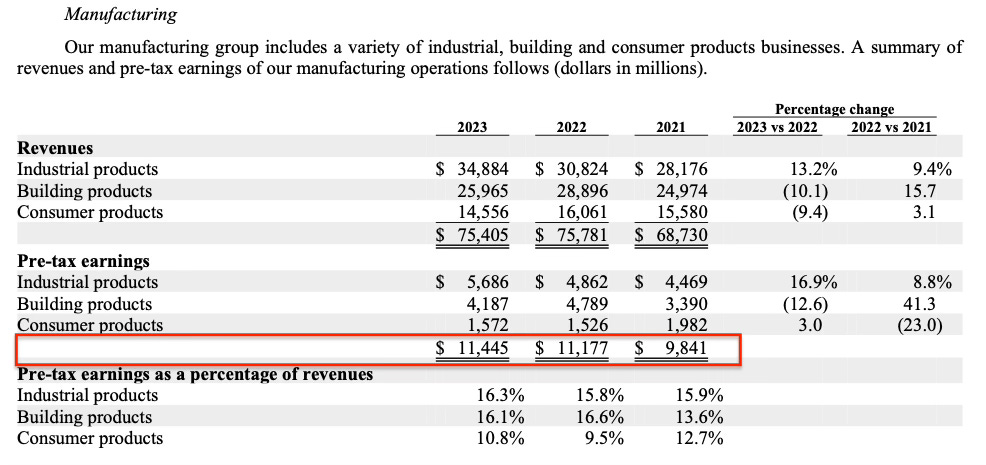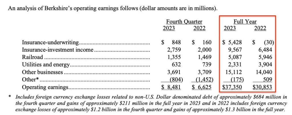 Berkshire’s press release further breaks down operating earnings so readers can get a sense of the performance of the conglomerate’s different sectors. While this is an insufficient substitute for the details found in the annual report, it is still useful: