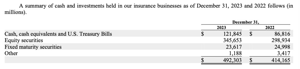 At the end of 2023, Berkshire held a record $163.3 billion of cash and short-term treasury bills excluding cash held in the railroad and utility businesses. Of this amount, $121.9 billion of cash and treasury bills were held within the insurance subsidiaries, along with $23.6 billion of interest-bearing fixed-maturity investments: