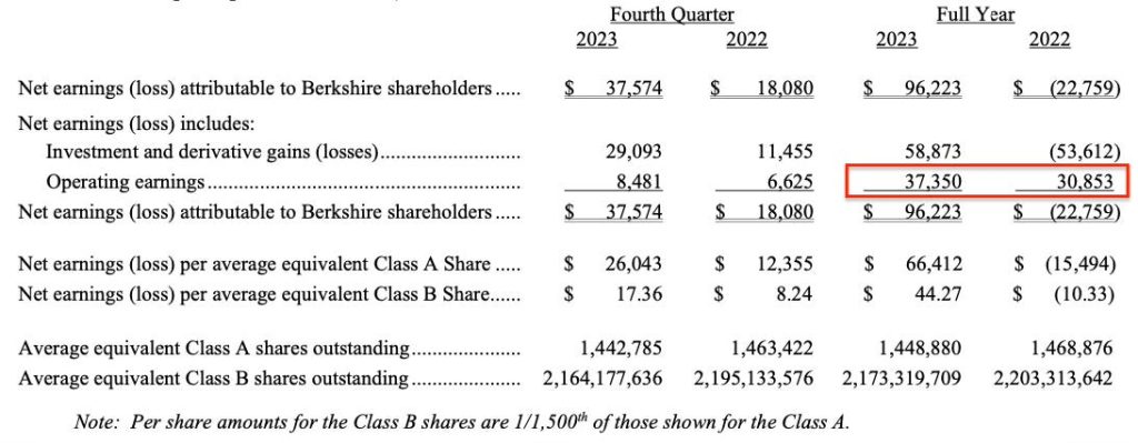 To provide the public with a more sensible high-level view of results, we are presented with a breakdown of net earnings between operating earnings and earnings related to investment gains and losses. We can see that Berkshire’s net operating earnings rose from $30.9 billion in 2022 to $37.4 billion in 2023.