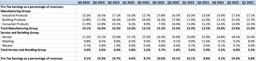 While going into the specific details of this vast array of businesses is not possible in this brief summary article, we can get a sense of the strong and weak points by looking at the breakdown of pre-tax earnings in each of the sectors: