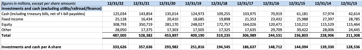“Berkshire’s insurance subsidiaries hold significant levels of invested assets. Investment portfolios are managed by Berkshire’s Chief Executive Officer and Berkshire’s other investment managers. Investments include a very large portfolio of publicly traded equity securities, which is unusually concentrated in relatively few issuers, as well as fixed maturity securities and cash and short-term investments. Generally, there are no targeted allocations by investment type or attempts to match investment asset and insurance liability durations. However, investment portfolios have historically included a much greater proportion of equity securities than is customary in the insurance industry.”