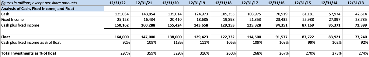 As noted previously, insurers do not face anything equivalent to runs on a bank, but it is interesting to note that even if a large percentage of Berkshire’s float suddenly disappeared, the company is run in such a way that no serious observer would claim that the funds could not be found to satisfy the claims. It is no exaggeration to say that Berkshire has a fortress balance sheet from the perspective of policyholders.