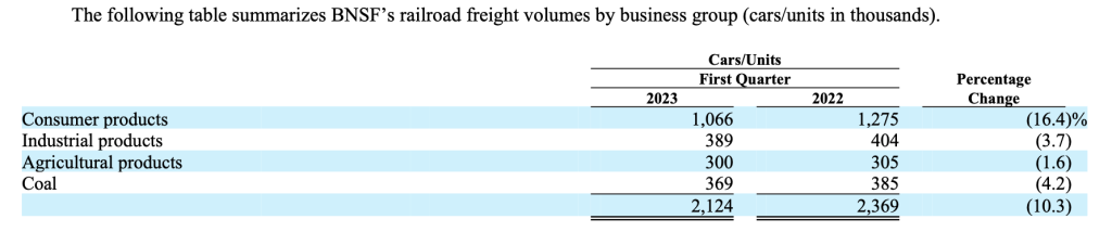 Management noted that the steep decline in consumer products was primarily due to lower intermodal shipments partly caused by the loss of an intermodal customer. Volume decreased in all product categories. Operating revenues increased compared to the first quarter of 2022 due to a 14% increase in average revenue per car/unit.