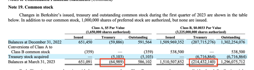Note that the number of A and B shares in my spreadsheet (in red boxes) matches the number of shares of treasury stock Berkshire reports in Note 19 of the 10-Q: