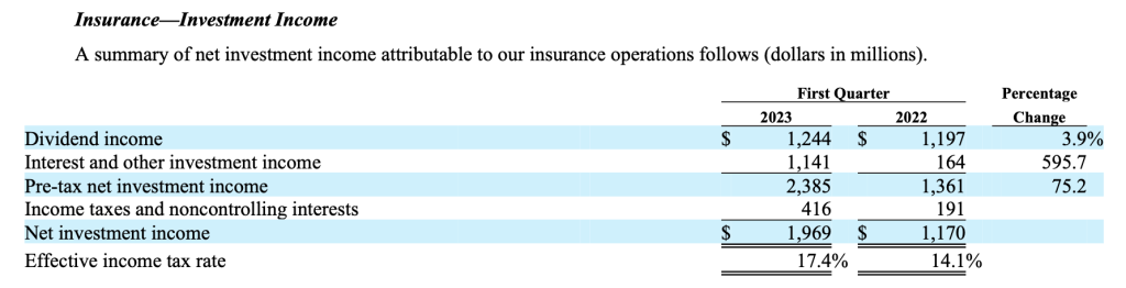 Berkshire posted a net underwriting profit of $911 million in the first quarter of 2023 compared to $167 million in the prior year, as we can see in the following table: