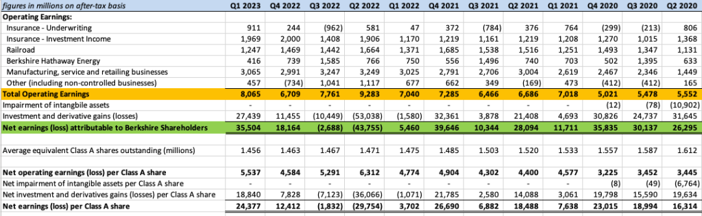 Berkshire’ insurance underwriting exhibits significant volatility on a quarterly basis which is an inherent part of the business model. Other groups, most notably Berkshire Hathaway Energy and the BNSF railroad, have seasonal patterns. For this reason, operating earnings fluctuate significantly from quarter to quarter. Many shareholders are satisfied with monitoring operating earnings on an annual basis.