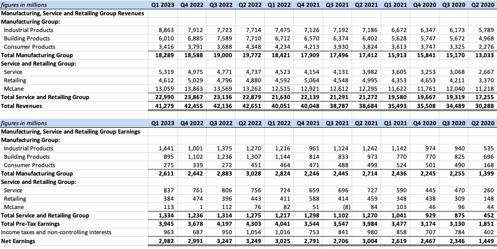 For the first quarter of 2023, Berkshire reported higher earnings in the industrial products group while showing declines in building products and consumer products. Precision Castparts, Lubrizol, Marmon, and IMC all reported higher revenue and pre-tax earnings. Within building products, Clayton Homes reported lower new home unit sales partially offset by higher average selling prices. Higher interest rates have dampened housing-related activity and management expects continued softness for the remainder of 2023. In consumer products, Forest River’s recreational vehicle business reported a 44% decline in unit sales as rising interest rates took a toll on business. These are just a few areas in this huge group of businesses that jumped out at me. Readers who are interested in a detailed breakdown should review pages 38 to 42 of management’s discussion in the 10-Q.