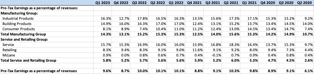 Berkshire Hathaway has numerous non-insurance operating businesses consolidated into the Manufacturing, Service and Retailing group. Results for the first quarter appear in the exhibit below: