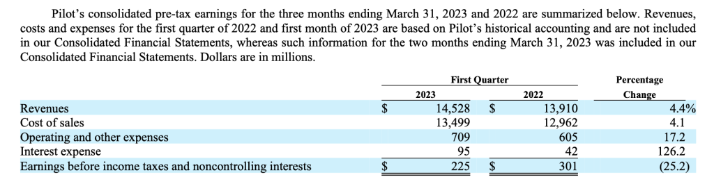 The following exhibit shows Pilot’s results for the entire quarter even though only February and March were actually included in Berkshire’s consolidated results: