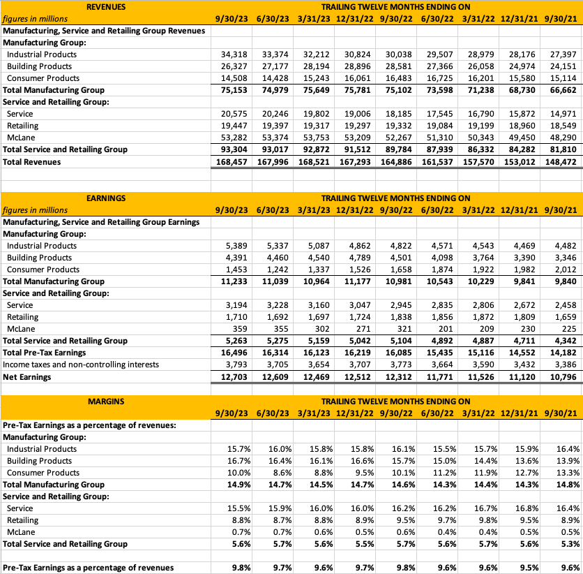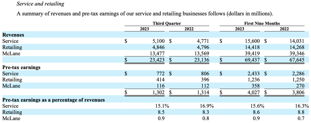 - McLane operates a large wholesale distribution business providing food and non-food products to retailers, convenience stores, and restaurants. The business is characterized by very low margins. Revenues declined by 0.7% in the third quarter and increased 0.2% in the first nine months of 2023 compared to 2022. Revenues were negatively impacted by lower unit volumes. Pre-tax earnings increased 3.6% in the third quarter and 32.6% in the first nine months of 2023 compared to 2022, reflecting a slight increase in gross margin and lower fuel expenses, partially offset by higher personnel expenses.