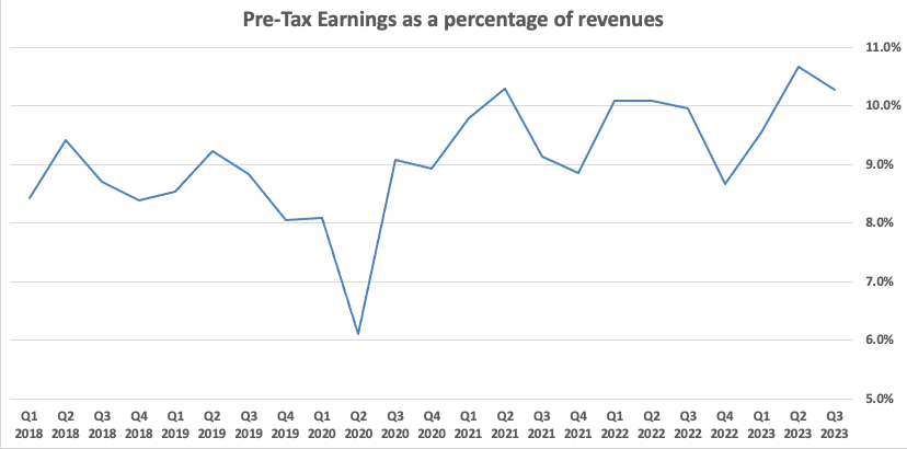 As expected, the figures are less volatile when viewed on a trailing twelve month basis, allowing us to spot trends without the effect of seasonal variations that exist in a quarterly sequential presentation. Taking a long view, trailing margins for the overall group have been on an upward trajectory. For the twelve months ending on September 30, 2019, pre-tax margin was 8.8% compared to 9.8% for the twelve months ending on September 30, 2023.