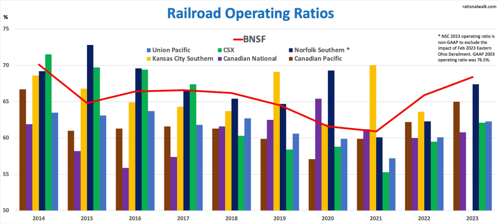 Norfolk Southern’s train derailment in East Palestine, Ohio on February 3, 2023, and the political and legal fallout from the accident, demonstrates the need for railroads to operate safely. One of the criticisms of precision scheduled railroading is that crews shrink and end up being potentially overworked, resulting in safety issues. Obviously, BNSF should not take cost-cutting actions to reduce the operating ratio if doing so results in safety problems, but all railroads operate in a highly regulated environment.