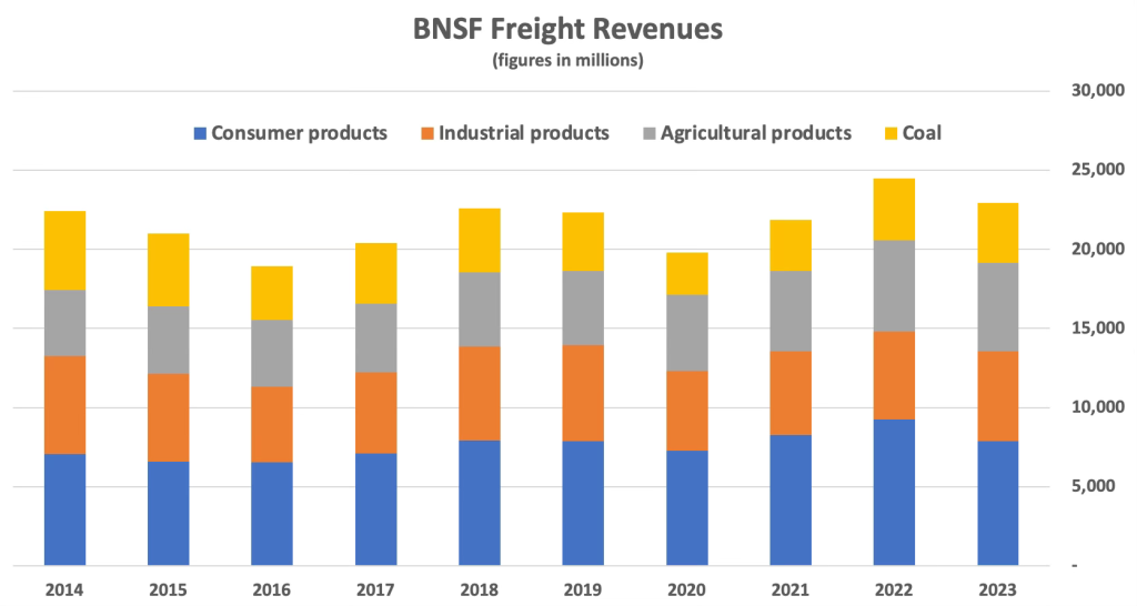 BNSF’s physical volumes have actually declined over the past decade, as measured by car/units shipped, from 10.3 million in 2014 to 9 million in 2023. Average revenue per car/unit has increased from $2,180 in 2014 to $2,549 in 2023. The net result is that freight revenues have been nearly flat over a decade, rising from $22.4 billion in 2014 to $22.9 billion in 2023. We should note that these are nominal figures. In real terms, BNSF has experienced a significant revenue decline over the past decade.