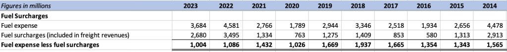 The decline in average revenue per car/unit was attributed primarily to lower fuel surcharge revenue. Since fuel prices declined in 2023, fuel surcharge revenue declined. Fuel surcharge revenue really represents a partial offset to fuel expenses. BNSF’s fuel surcharge revenue compared to fuel expense is shown below for the past decade: