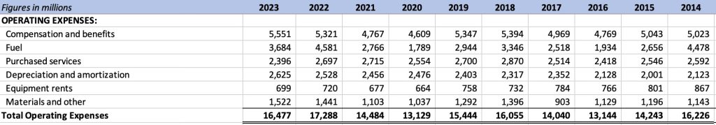 Compensation rose by 4.3% in 2023 due to increased headcount, wage inflation, and the addition of employee costs related to Montana Rail Link.6 Fuel expenses were lower due to lower fuel prices, lower volumes, and improved fuel efficiency. Purchased services were lower primarily due to the sale of the brokerage operations of BNSF Logistics, partially offset by general inflation. The exhibits below show the categories of operating expenses over the past decade and the operating ratio: