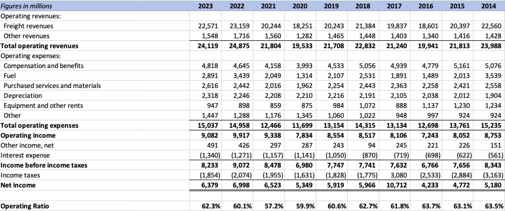 - From 2014 to 2023, BNSF reported a cumulative total of $227.7 billion of operating revenues and $77.2 billion of operating income.