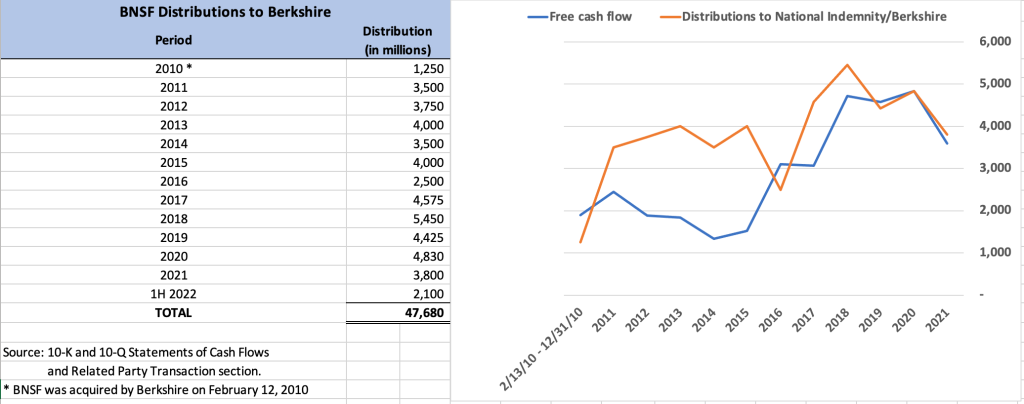 The left side of the following exhibit shows the distributions from BNSF to Berkshire and the right side shows the distributions plotted against free cash flow.