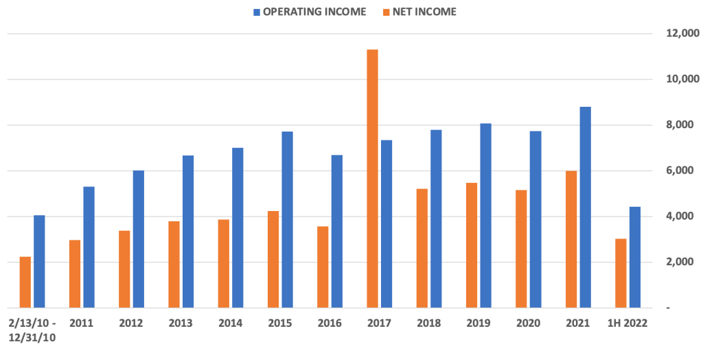 In total, from February 13, 2010 to June 30, 2022, BNSF generated $87.6 billion of operating income, $77.3 billion of pre-tax income, and $60.2 billion of net income.
