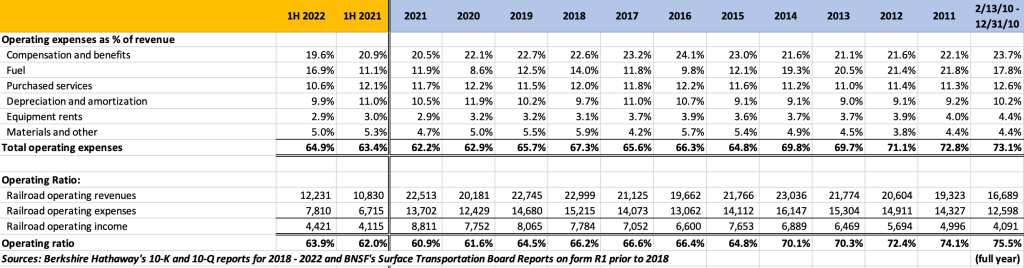 - We could derive the operating ratio directly from BNSF’s reported operating expenses and operating income, but one complication involves BNSF Logistics, a subsidiary that provides supply chain solutions extending beyond rail transportation. While recent BNSF financial statements segregate revenue from BNSF Logistics, operating expenses attributable to BNSF Logistics are not separately broken out in BNSF’s financials. Starting in 2018, Berkshire’s financials provide sufficient data to calculate the operating ratio and prior to that point, I have obtained data from BNSF’s filings with the Surface Transportation Board. [↩]