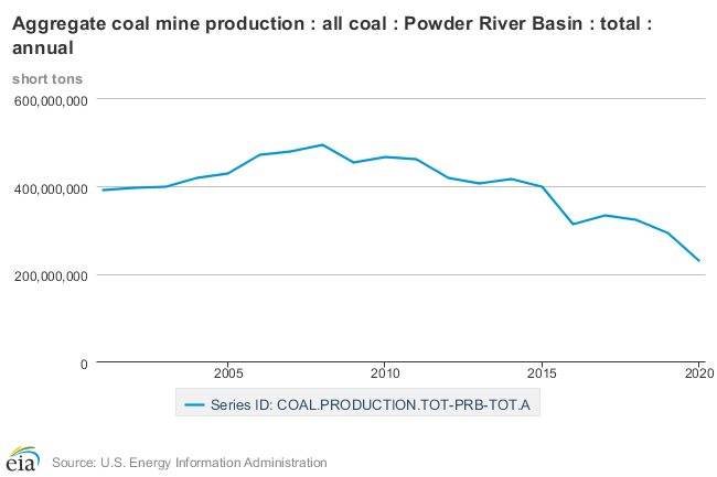 BNSF has historically been a critical link in the shipment of coal from the Powder River Basin located in Wyoming and Montana to coal-fired power plants. The Powder River basin is the largest coal producing region of the United States, but production has been in decline for several years as we can see from this chart: