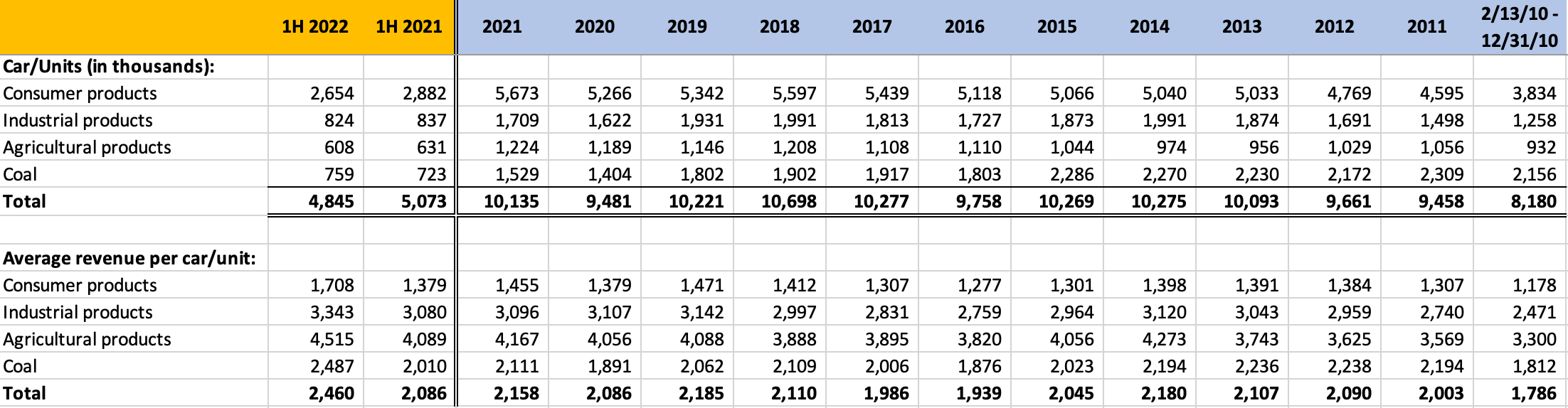 We can see that BNSF shipped a total of 10.1 million carloads in 2021 and the average revenue earned from each carload was $2,158. However, the composition of carloads by product type varies from year to year and the average revenue per carload varies based on the type of product. For example, the average revenue per carload of consumer products is lower than the average revenue per carload of other products.