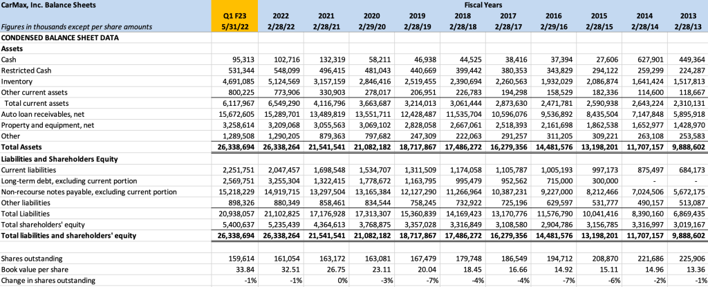 The following exhibit is a condensed version of the CarMax balance sheet over the past decade which displays key accounts: