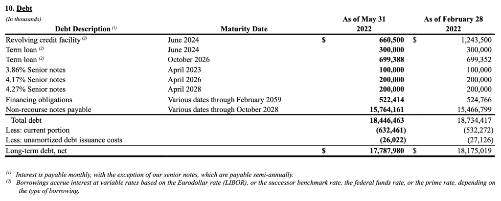 CarMax carries significant debt, but it is important to note that the largest liability is represented by non-recourse notes which approximate the level of net auto loan receivables, as discussed more fully in the CAF section above. Other debt consists of a revolving credit facility, term loans, and senior notes. The composition of CarMax’s debt is shown in the exhibit below: