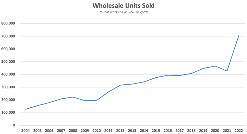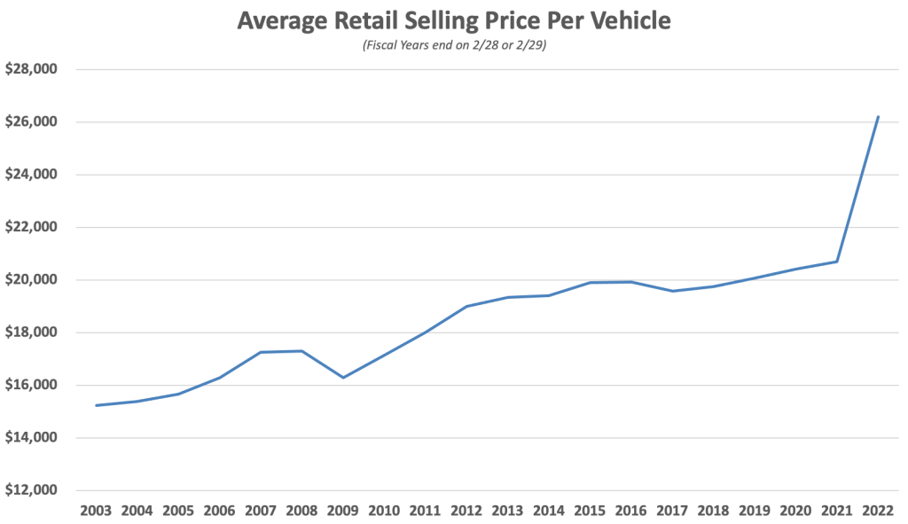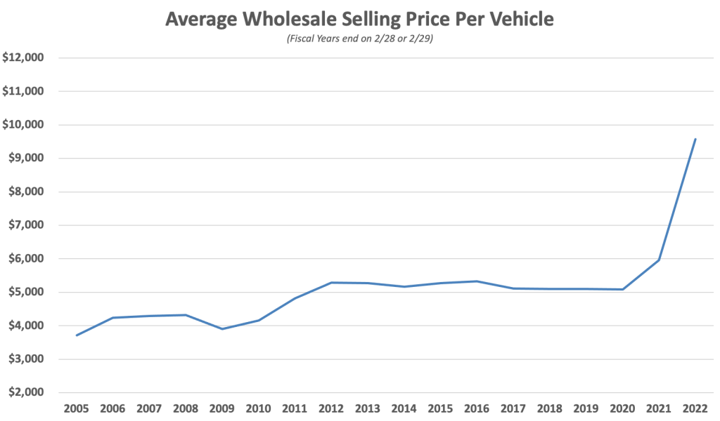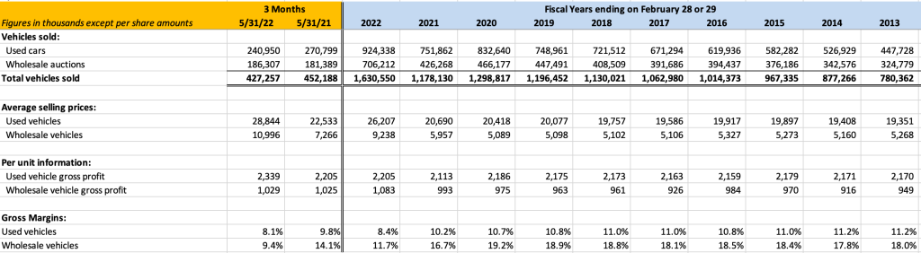 - Business boomed in fiscal 2022 with revenue increasing by 68.3% and net income increasing by 54.1%. Revenue was boosted by a combination of higher unit volume coupled with dramatically higher prices in the retail and wholesale channels due to rapid inflation in the price of used vehicles.