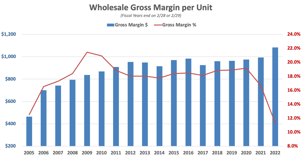 Gross margin represents the difference between the price a vehicle sells for and the cost of acquiring and reconditioning prior to sale. Over the past decade, gross margin per vehicle has been in the $2,000 to $2,200 range. During that period, used vehicle prices rose only slowly and gross margin as a percentage of selling price declined gradually from 12% in fiscal 2011 to 10.2% in fiscal 2021. During fiscal 2022, prices increased significantly. Gross margin as a percentage of selling price declined to 8.4% even as gross margin per-unit in dollar terms reached a record high.