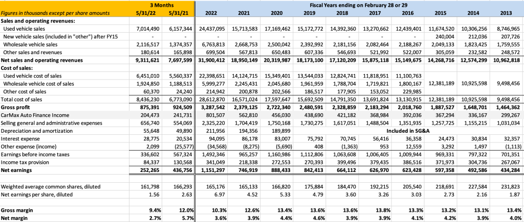 - All financial data comes from the CarMax’s SEC filings. CarMax operates on a non-standard fiscal year which ends on February 28 or 29. The figures cited are for the four fiscal quarters that ended on May 31, 2022. Total vehicles sold of 1,605,619 during this period were comprised of 894,489 vehicles sold at retail and 711,130 sold at wholesale via auctions. [↩]