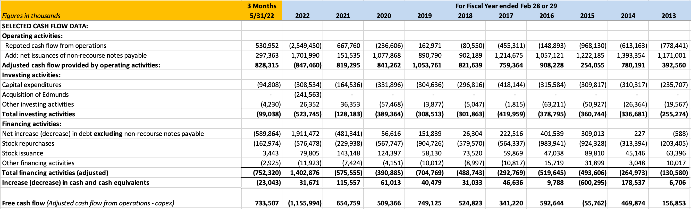 In the interest of conservatism, my free cash flow estimate deducts the full amount of capex from adjusted cash flow from operations even though a portion of capex is attributable to expansion of retail stores over the years. In fiscal 2022, CarMax made its first-ever acquisition when it purchased Edmunds for $241.6 million.