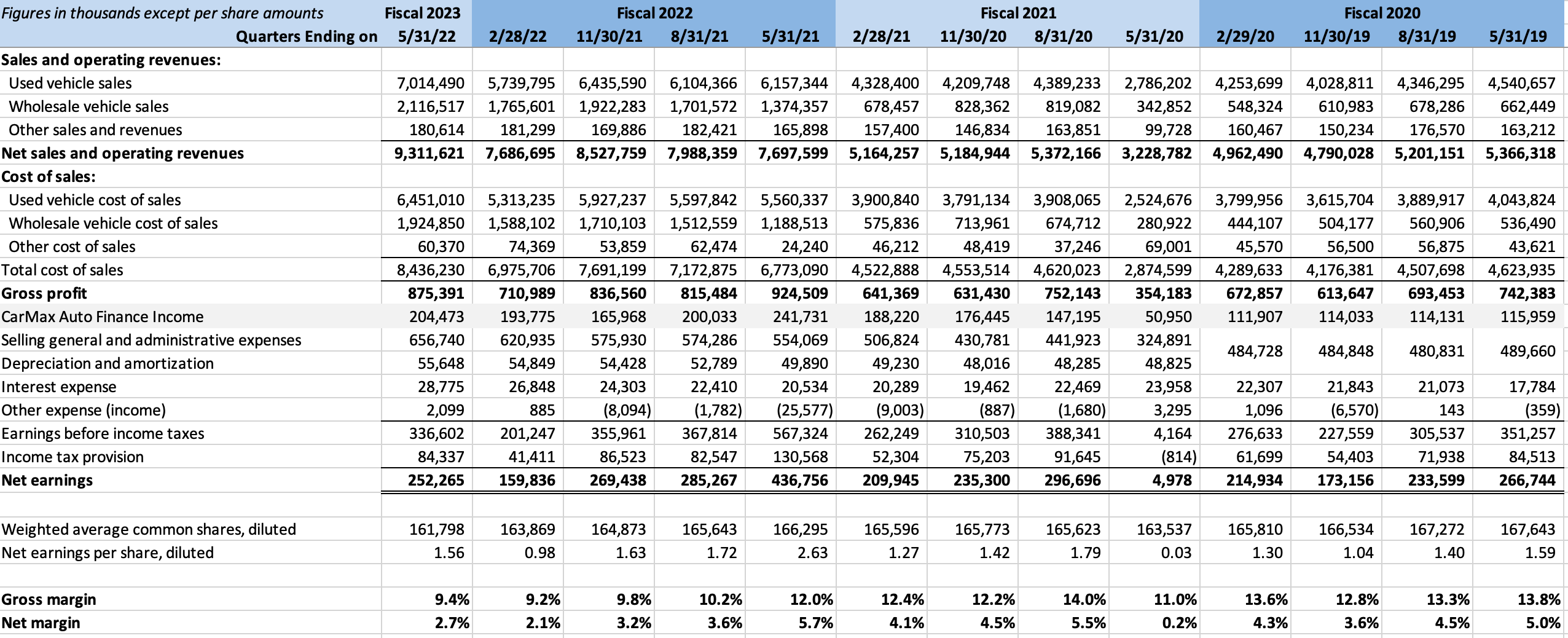 - All financial data comes from the CarMax’s SEC filings. CarMax operates on a non-standard fiscal year which ends on February 28 or 29. The figures cited are for the four fiscal quarters that ended on May 31, 2022. Total vehicles sold of 1,605,619 during this period were comprised of 894,489 vehicles sold at retail and 711,130 sold at wholesale via auctions. [↩]