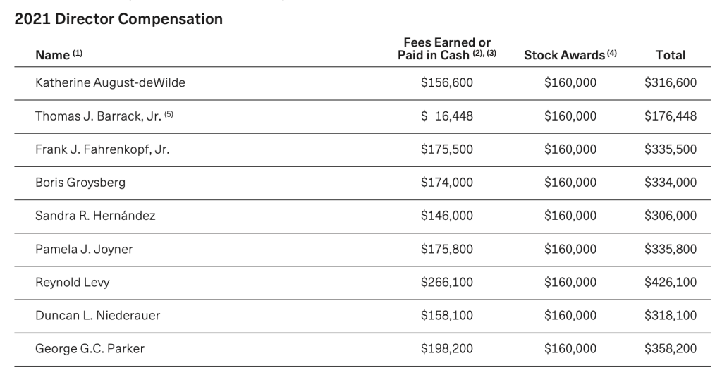 Several pages follow that detail the company’s diversity policy culminating in a categorization of directors by gender and ethnicity, both of which represent attributes that are irrelevant when it comes to evaluating management competence and performance. Finally, on page 33, we are presented with director pay for 2021: