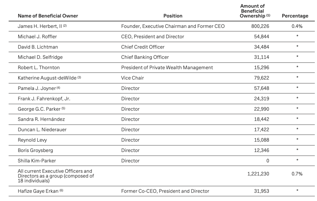 It is interesting to note that the company’s section on “Environmental and Social Responsibility” appears before its section on “Share Ownership”, perhaps unintentionally signaling where the bank places its priorities. On page 51, we are presented with the beneficial ownership of the bank’s executive officers and directors who, in aggregate, control only 0.7% of the shares outstanding, with the majority of that amount controlled by the bank’s founder.