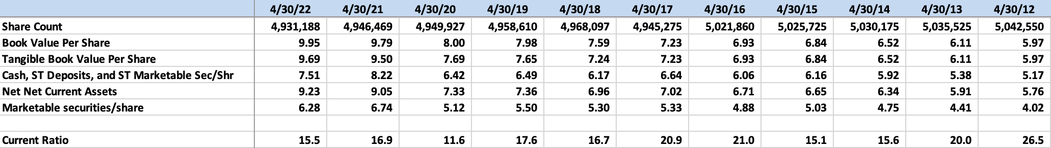 GRI has a fortress balance sheet and is overcapitalized relative to the requirements of its operating business. This was true when I first looked at the company a dozen years ago and is even more true today. The company’s investment portfolio has increased from $20,280,000 on April 30, 2012 to $30,979,000 on April 30, 2022. In addition to the investment portfolio, the company has $6,078,000 of cash on the balance sheet. The following exhibit shows the evolution of the balance sheet over the past decade: