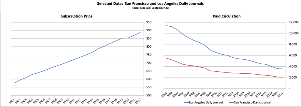 To some degree, the niche market nature of the company’s newspapers has softened the blows that nearly all local newspapers have suffered in recent years. The Daily Journals accounted for 92% of total circulation revenues in fiscal 2022. While the company has been able to raise the regular subscription price at a 2% compounded rate over the past two decades, combined circulation of the Daily Journals has declined from 16,400 in fiscal 2002 to 5,640 in fiscal 2022.