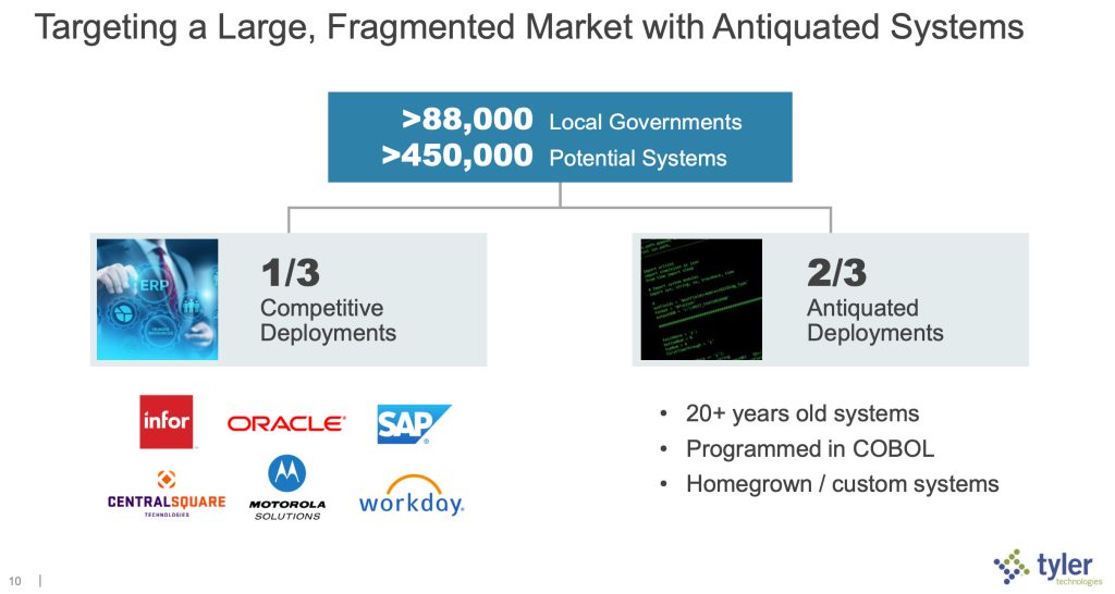 Tyler Technologies, one of Journal Technology’s most important competitors, estimates that two-thirds of its target market are organizations with homegrown or custom systems that are over twenty years old and coded in COBOL, a programming language that is much less flexible than modern languages.