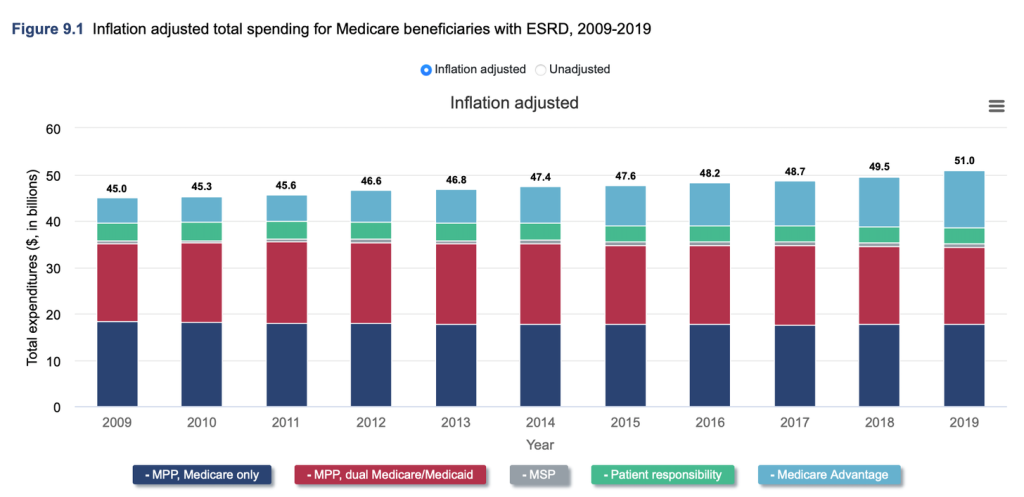 Traditional Medicare covers 80% of the cost of treatment with the patient responsible for the remaining 20%. In cases where the patient has private health insurance, there is a 30 month coordination during which the private insurance plan continues to pay for kidney related coverage. Total spending for Medicare beneficiaries with ESRD was $51 billion in 2019 and has been rising in inflation-adjusted terms in recent years, as the following chart shows: