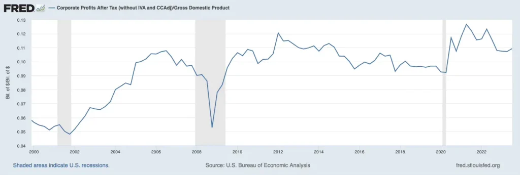 It is remarkable to see how the share of GDP going to profits increased during the 2000s. Aside from the financial crisis, after-tax profits held above 10% for much of the 2010s. At the end of 2016, the figure stood at just above 10%. This has spiked even higher in recent years to remarkably high levels, with tax cuts representing a tailwind. Although social and political pressures have increased, with progressives vocally criticizing corporate profitability, it is notable that the corporate tax cuts that passed in 2017 were permanent while the individual income tax cuts expire in 2025.