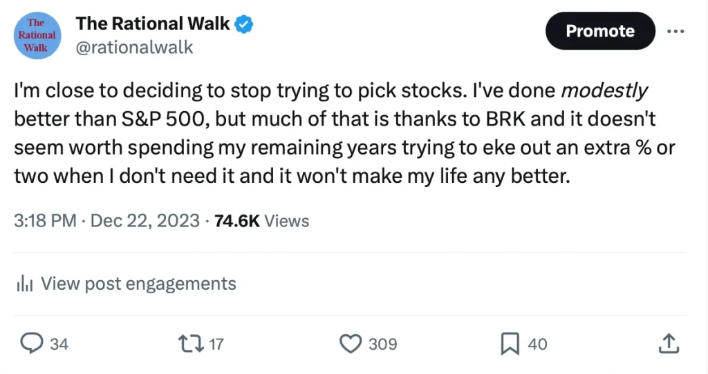 Recently, I have been questioning whether it makes sense to continue investing in individual stocks in the future. As I was thinking about this, I decided to post the following on X/Twitter assuming that it would attract just a few responses. However, it attracted quite a bit of attention and the point I made was misunderstood.