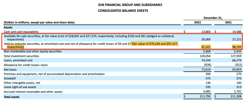 We can see that SVB categorizes its securities into two “buckets” — available-for-sale (AFS) and held-to-maturity (HTM). GAAP accounting requires AFS securities to be marked-to-market which reflects the actual value of the securities which can either come from quotations in active markets or good faith attempts to estimate the market value of illiquid securities. However, GAAP accounting permits HTM securities to be recorded at amortized cost, net of allowances for credit losses. We can see that SVB’s HTM securities were carried on the balance sheet at $91.3 billion as of December 31, 2022, but fair value was far lower at $76.2 billion.