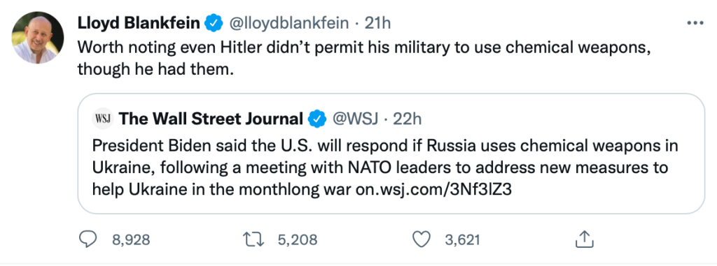 The situation in Ukraine is horrendous and getting worse every day. The situation is not helped by spreading falsehoods about the even worse horrors of prior wars. I’ll give Mr. Blankfein the benefit of the doubt and conclude that he’s merely ignorant. Perhaps some intellectual humility will come in handy the next time he decides to opine on something he apparently knows nothing about, whether shoehorned into 280 characters on Twitter or speaking at the next World Economic Forum at Davos.